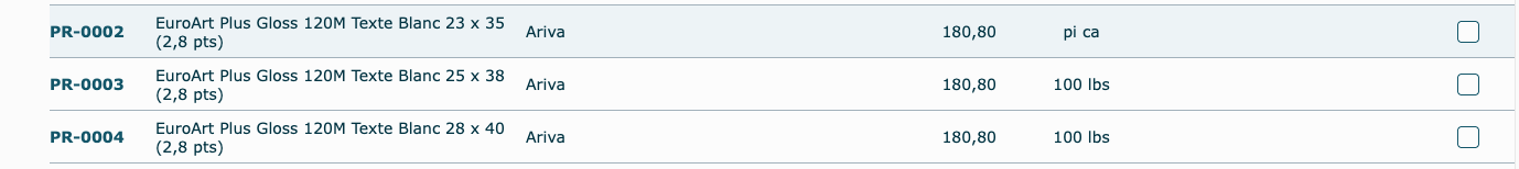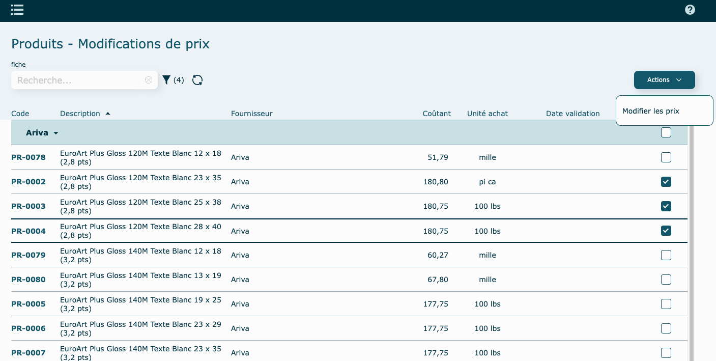 La case à cocher située dans l’entête bleu du fournisseur permet de sélectionner tous les produits associés à ce fournisseur, mais assurez-vous d'avoir bien isolé la famille de produit que vous vouliez modifier.