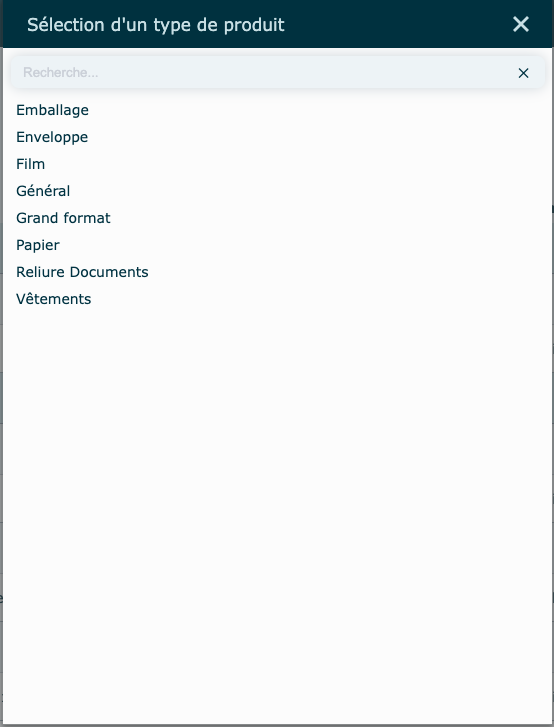 Chaque produit doit être associé à l'un des 7 types suivants : Emballage, Enveloppe, Film, Général, Grand format, Papier, Reliure documents.