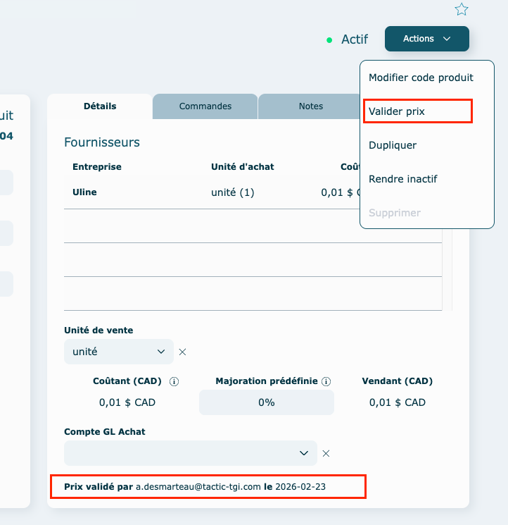 • Menu Actions : Valider prix
