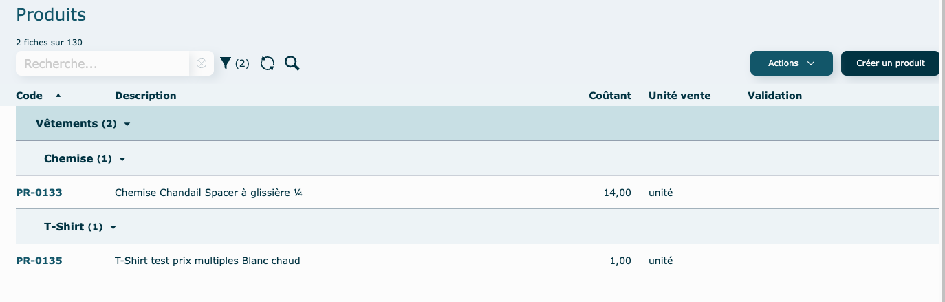 Inactif : le produit apparaitra grisé dans la liste