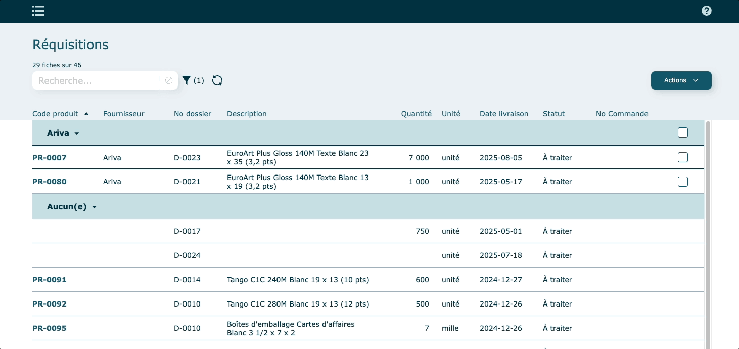 Une fois votre sélection faite, cliquez sur Actions pour procéder soit à la commande des produits ou pour annuler les réquisitions.