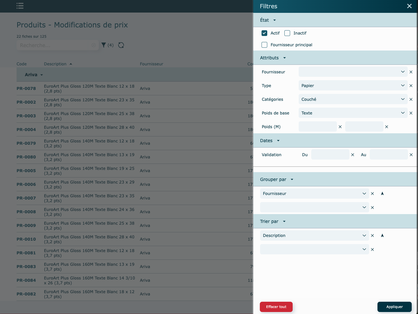 La case à cocher située dans l’entête bleu du fournisseur permet de sélectionner tous les produits associés à ce fournisseur, mais assurez-vous d'avoir bien isolé la famille de produit que vous vouliez modifier.