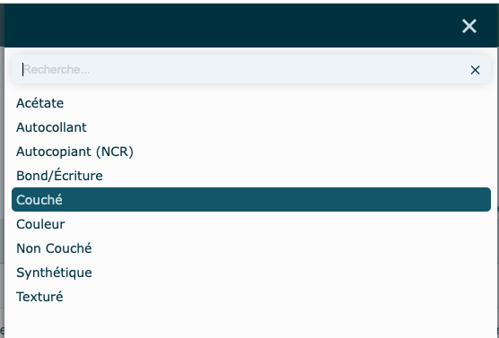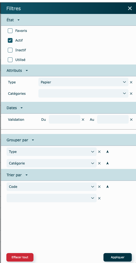 Par défaut, le filtre est à Actif. Pour choisir un type, vous pouvez ajuster votre filtre ou bien utiliser la barre de recherche en haut pour trouver un papier spécifique, par exemple.