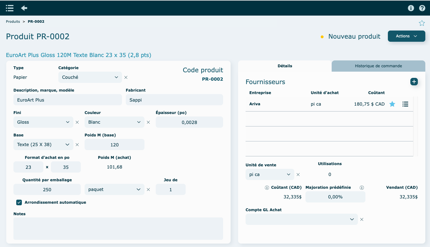 Le module Produits permet de consigner toute l’information pertinente pour chaque papier ou autre substrat standard utilisé dans vos mandats. Ces données alimenteront les modules d’estimation et d’achats, ainsi que les réceptions et consommations.