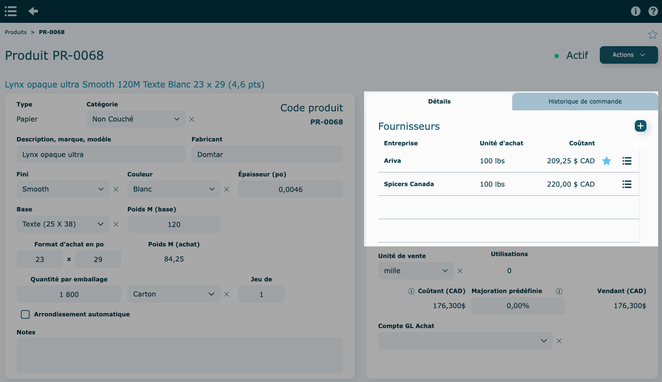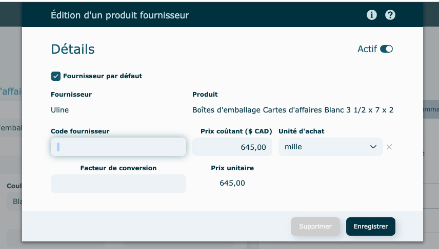 Chaque produit doit avoir au moins un fournisseur de base avec un prix coûtant et son unité d'achat. Vous devez identifier quel fournisseur sera celui par défaut et qui servira à bâtir le prix vendant pour la soumission.