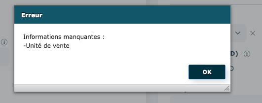 Si certains champs obligatoires pour la validation d'un prix ne sont pas remplis (selon le type de produit), vous obtiendrez un message d'erreur et vous devrez les remplir correctement pour poursuivre.