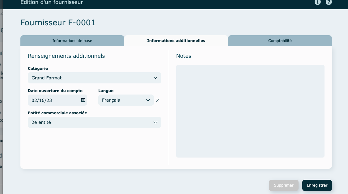 Inscrire la catégorie de ce fournisseur et choisir également votre entité commerciale. Par défaut, ce sera celle sélectionnée dans les Paramètres Système.