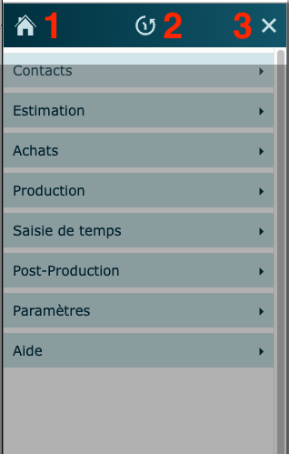 Le menu principal est accessible à travers le logiciel dans la plupart des écrans au coin supérieur gauche de l'écran. Il permet la navigation entre les les différents modules.