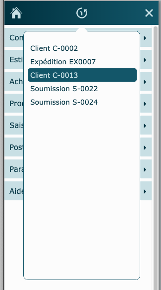 Il contient les 20 derniers enregistrements officiels visités (tables principales de module), permettant de retourner rapidement au dernier travail effectué.