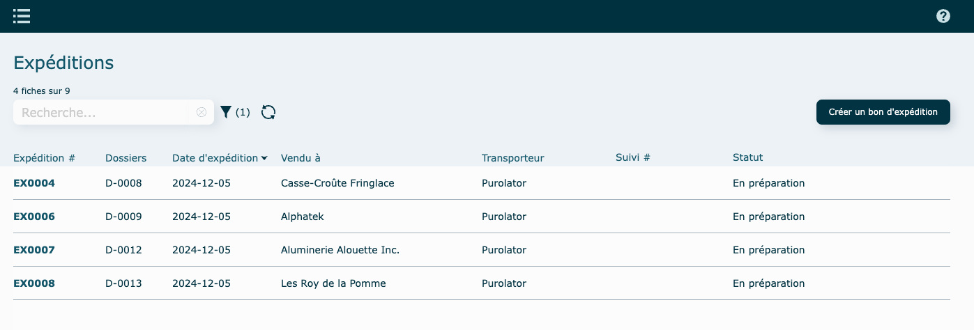 • Cliquez sur Créer un bon d'expédition en haut à droite de la liste.
