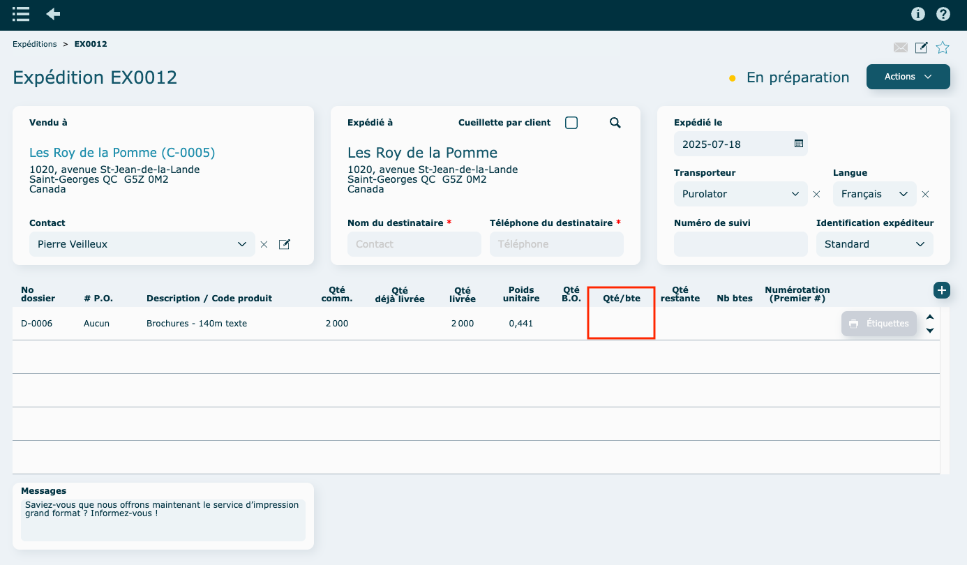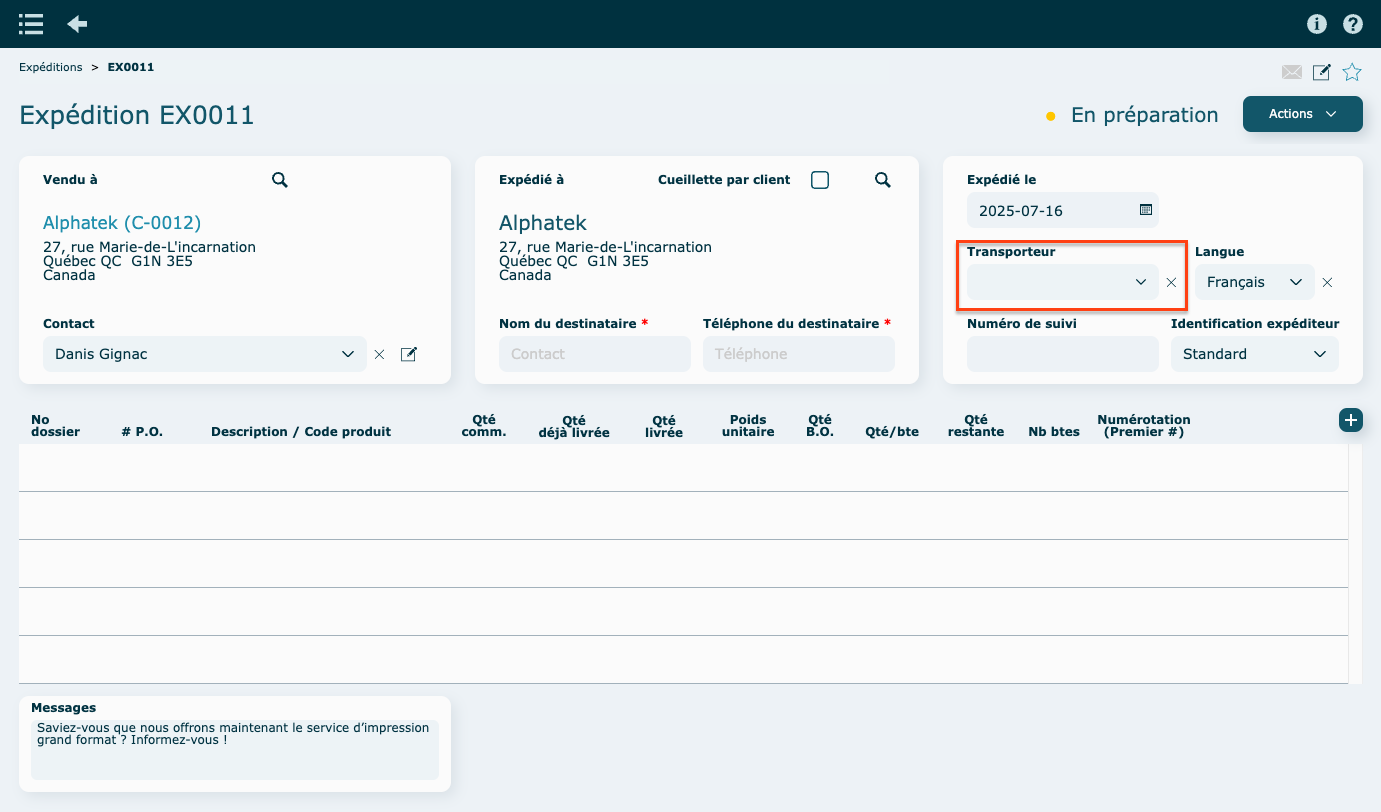 L'information de la commande au transporteur sera visible dans le bas de l'écran de l'expédition.