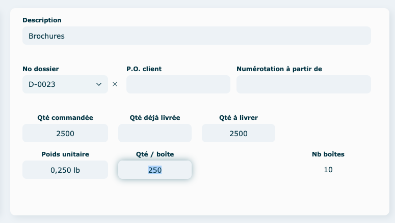 Remplir les informations manquantes. Les champs marqués d'une étoile sont obligatoires. Inscrire la quantité par boîte, le nombre de boîte requise va se calculer automatiquement.
