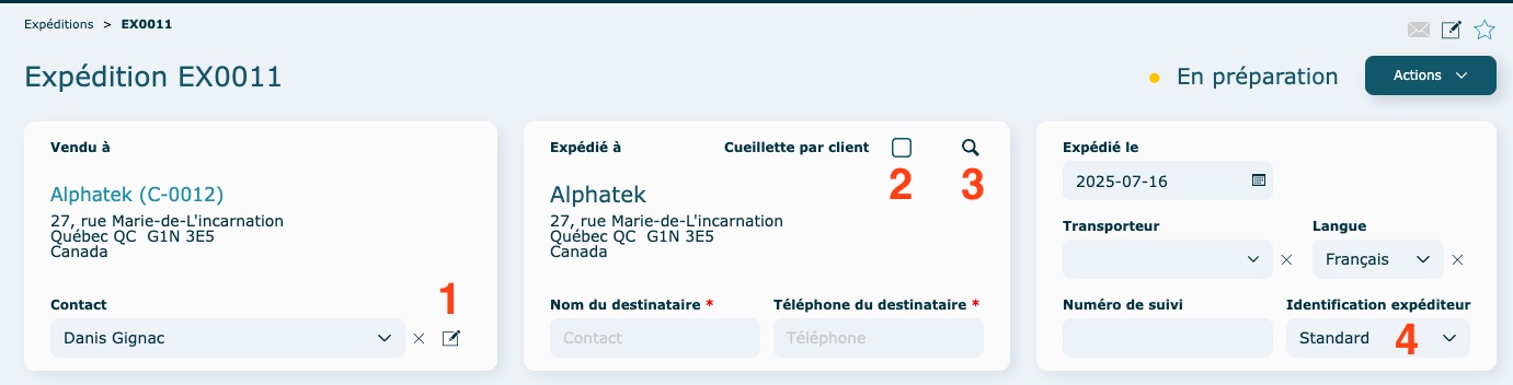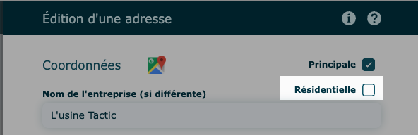 Si l'adresse du destinataire est une résidence, cette information doit avoir été préalablement remplie dans l'adresse de livraison, dans le module Clients. Cette information est très importante, puisque les taux seront affectés par cette donnée.