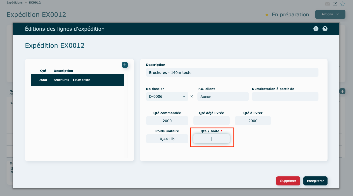 N'oubliez pas de remplir la case Qté/bte, en cliquant sur la ligne pour faire ouvrir la fenêtre d'édition.