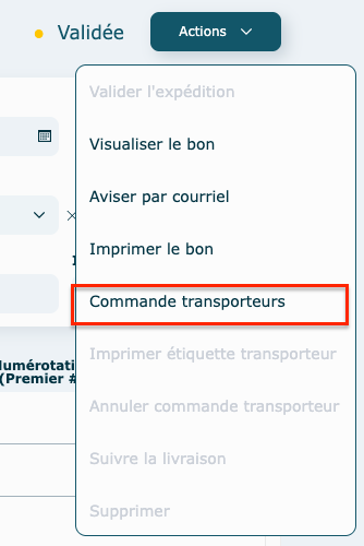 Cliquer dans le menu Actions, puis Commande transporteurs. Si le bouton est grisé, c'est que vous devez Valider le bon en premier.