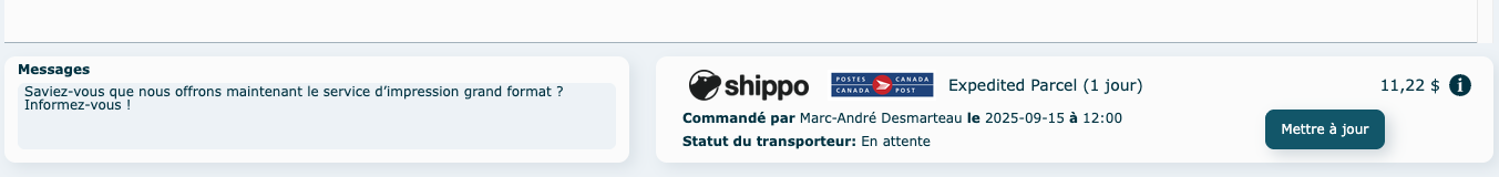 Bien qu'une cédule sera en place pour mettre à jour régulièrement le statut de la commande tant qu'elle n'est pas complétée, vous pourrez actualiser manuellement le statut venant du transporteur, en appuyant sur Mettre à jour.