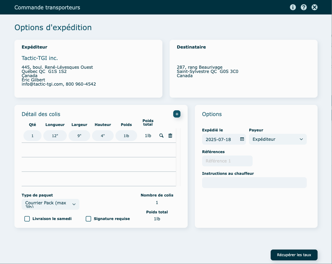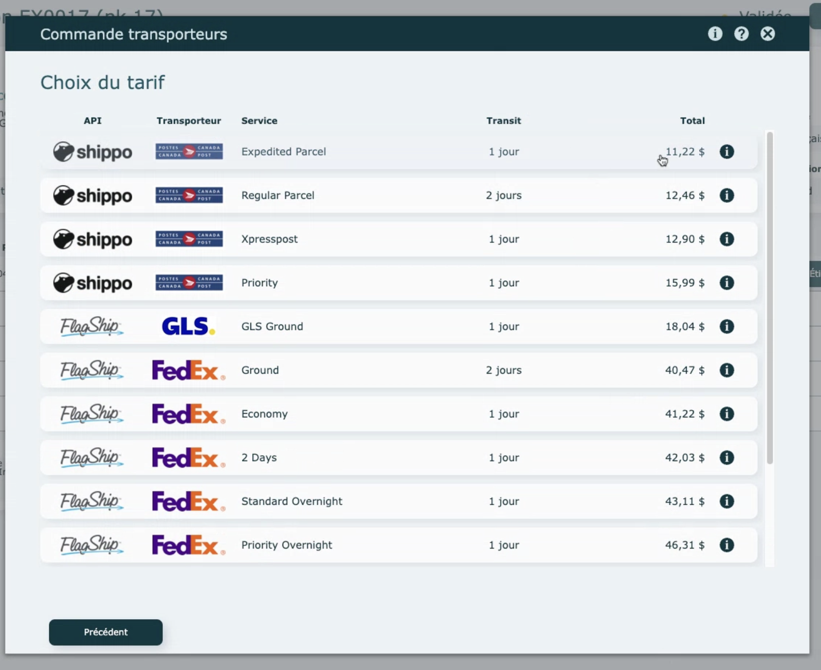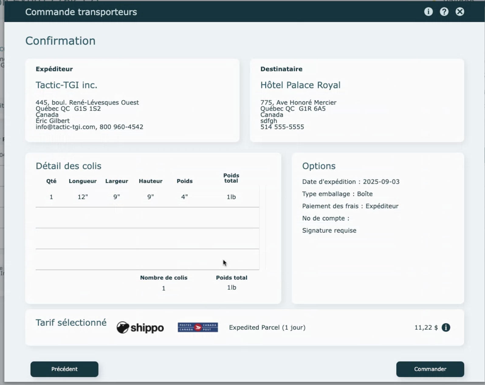 Vous pouvez alors sélectionner le taux désiré, faire une dernière vérification des données puis faire le bouton Commander. Comme pour la récupération de taux, vous pourriez recevoir des alertes d'erreur ou de notifications de la part de l'api du transporteur.