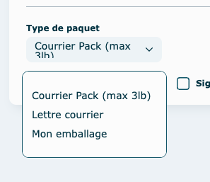 Entrez ou modifiez les informations au niveau des boîtes (nombre, format, type, etc), puis remplissez les autres champs selon votre besoin (livraison le samedi, signature requise, date d'expédition, etc).