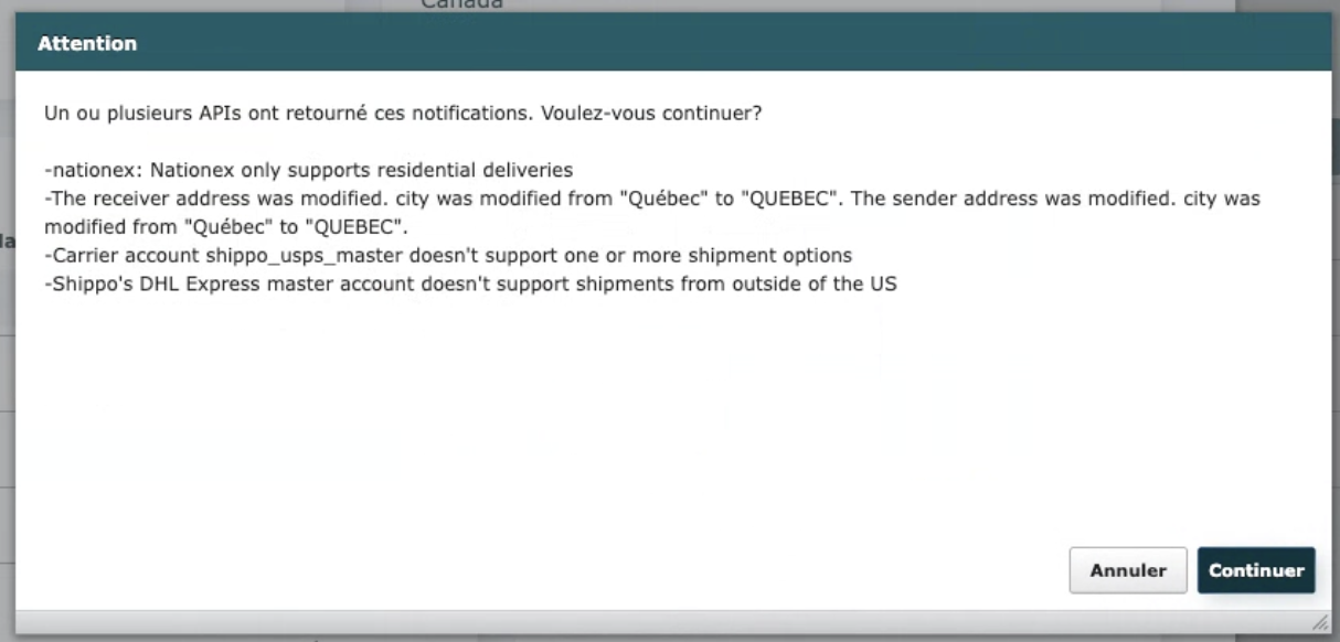 Une fois les taux bien récupérés, l'api du transporteur pourrait vous proposer des changements mineurs ou des notifications. Cliquez sur Continuerpour accepter les suggestions.