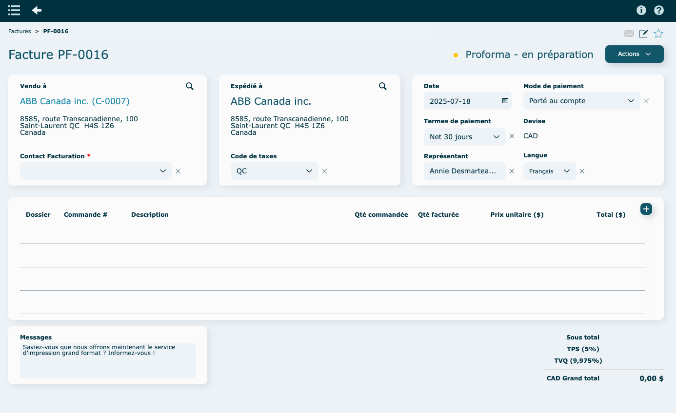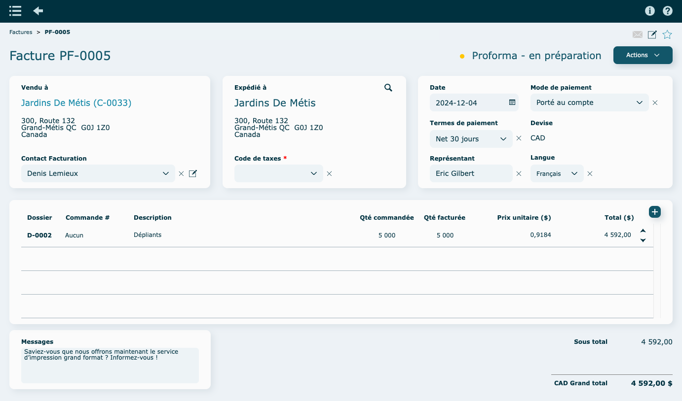 Le module Facturation permet de produire des factures de vente selon la mise en forme souhaitée en rappelant le numéro d’un dossier, ce qui affiche automatiquement le nom du travail, la quantité commandée et le prix unitaire.