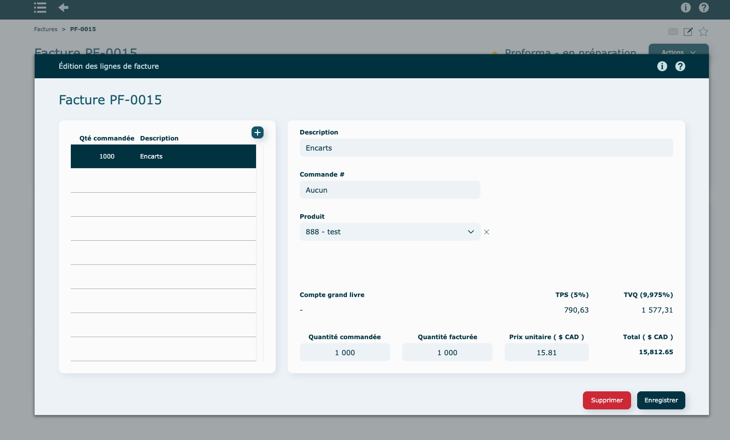 Remplir les informations (description, quantité et prix), puis Enregistrer. Vous pouvez ajouter d'autres lignes de texte directement dans cette fenêtre, en cliquant sur l'icône
