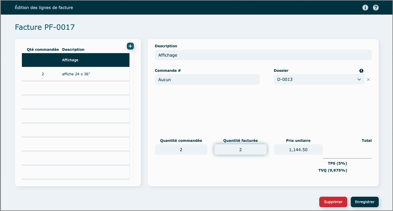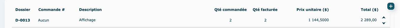 La Qté facturée est la quantité totale du dossier, à laquelle on soustrait les quantités qui pourraient avoir déjà été facturées pour ce dossier. Assurez-vous de la remplir si elle ne l'est pas déjà, en cliquant sur la ligne pour faire apparaitre la boîte d'édition.