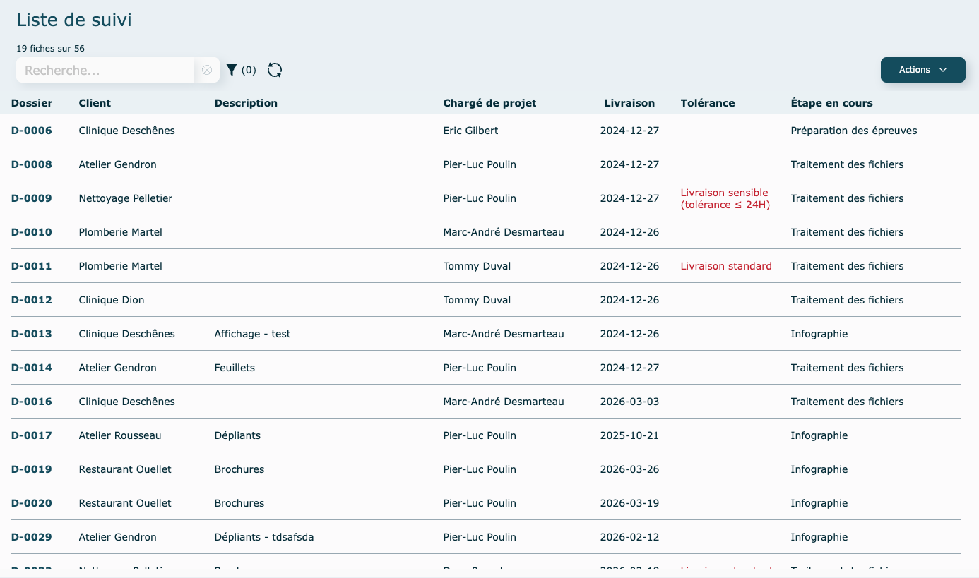 Chaque lancement de travail en production est ajouté à cette liste et y demeure tant que le dossier n’est pas facturé, ce qui permet d’avoir la liste complète des contrats actifs.