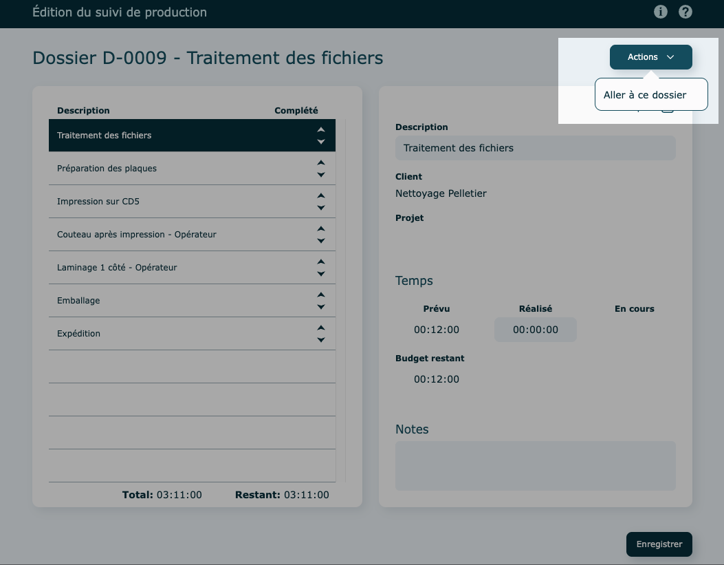 Le temps total prévu et restant (opérations non terminées) se trouve dans la portion de droite. Vous pouvez aussi cliquer sur une opération et la terminer par la case Complet en haut à droite.