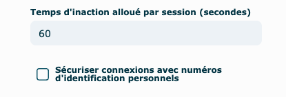 Également, vous pouvez choisir un délai (temps d'inaction) avant que l'utilisateur ne soit sortie de son interface. Cela permet à l'utilisateur de ne pas bloquer la session s'il quitte pour travailler. Généralement, nous conseillons de mettre 60 ou 120 sec maximum.