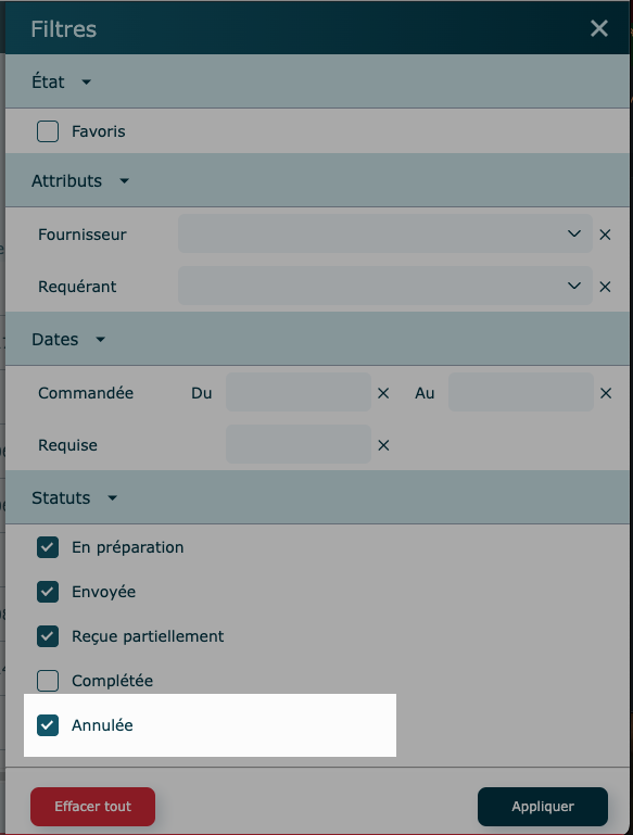 Par défaut, les enregistrements annulés ne sont pas visibles dans les listes, à moins de cocher la case dans votre filtre.
