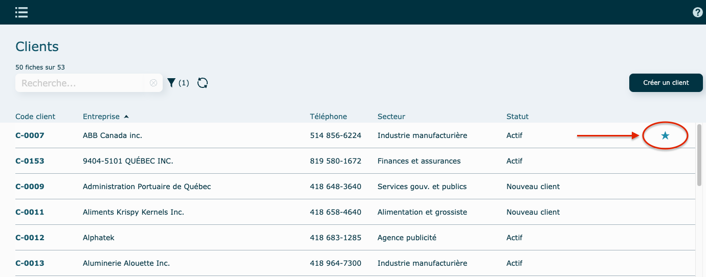 Cliquer sur l'étoile blanche pour identifier une fiche comme Favori, elle deviendra bleue.