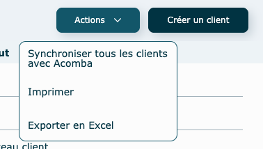 Dans toutes les modes listes des modules et tous les rapports, vous trouverez dans l'icône Actions, un bouton Exporter en Excel et un bouton Imprimer.