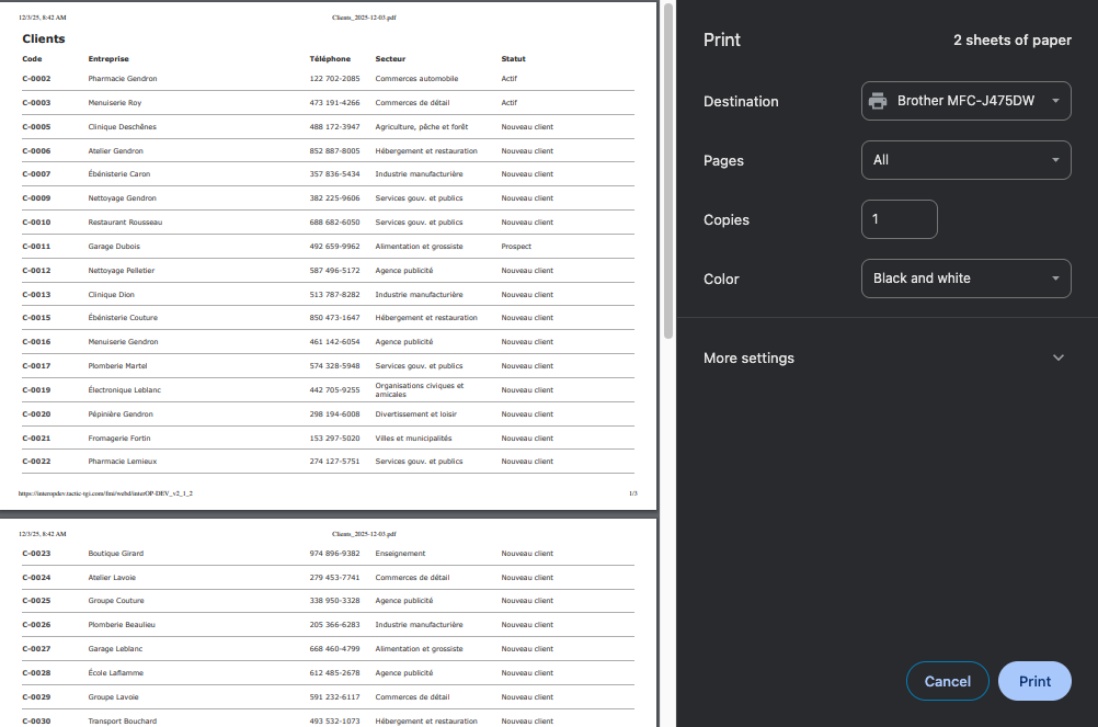 Lorsque vous cliquerez sur le bouton Imprimer, une boîte de configuration d'impression s'ouvrira.