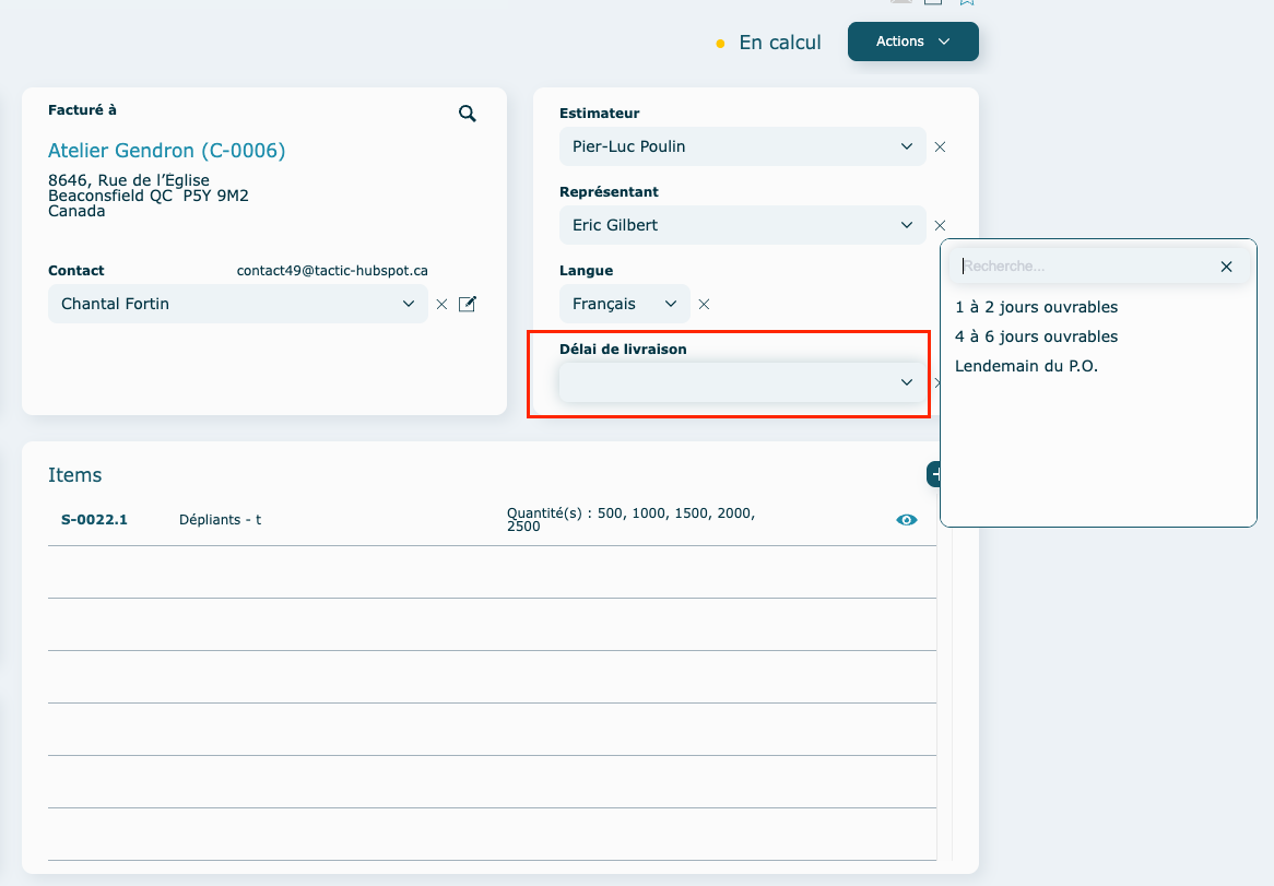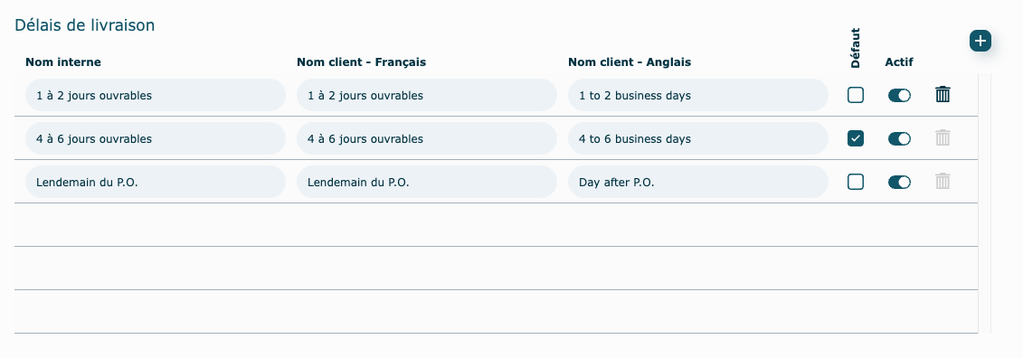 Entrez ici vos délais de livraison, qui pourront être sélectionnés à la soumission, puis présentés sur la proposition au client. Vous pourrez également sélectionner le délai à utiliser par défaut, ainsi que choisir ceux qui seront présents dans le menu déroulant en les cochant comme étant actifs.