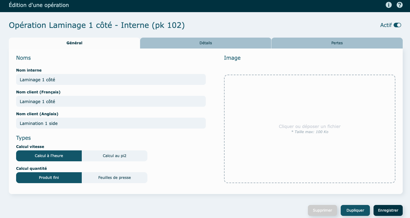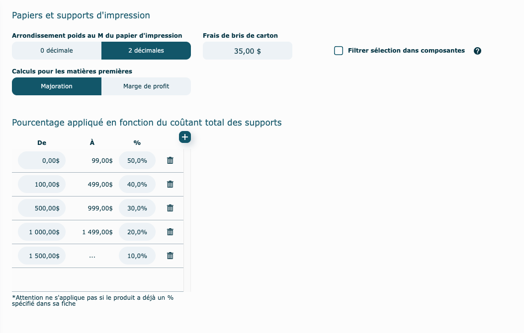 Cette section a été élaborée pour consigner tous les standards requis afin de produire une soumission. Vous y consignerez vos différentes majorations, vos taux horaires (coûtant/vendant), la liste de vos équipements d'impression, les opérations diverses internes et externes, etc.