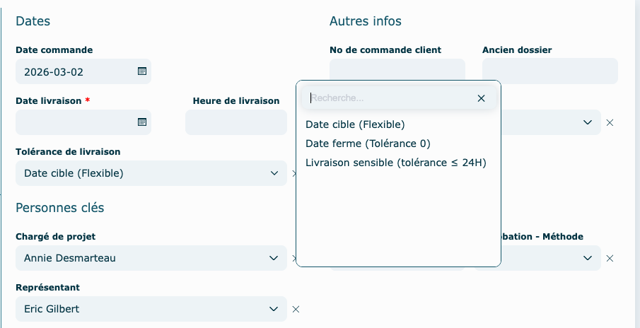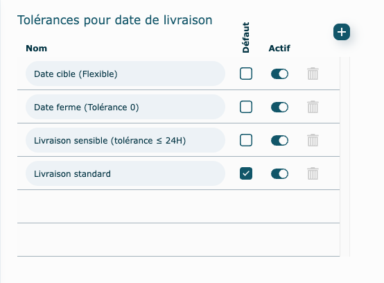Dans ces standards, vous pourrez contrôler les données affichées dans le menu de tolérance de livraison, affiché au dossier et dans la liste de suivi.