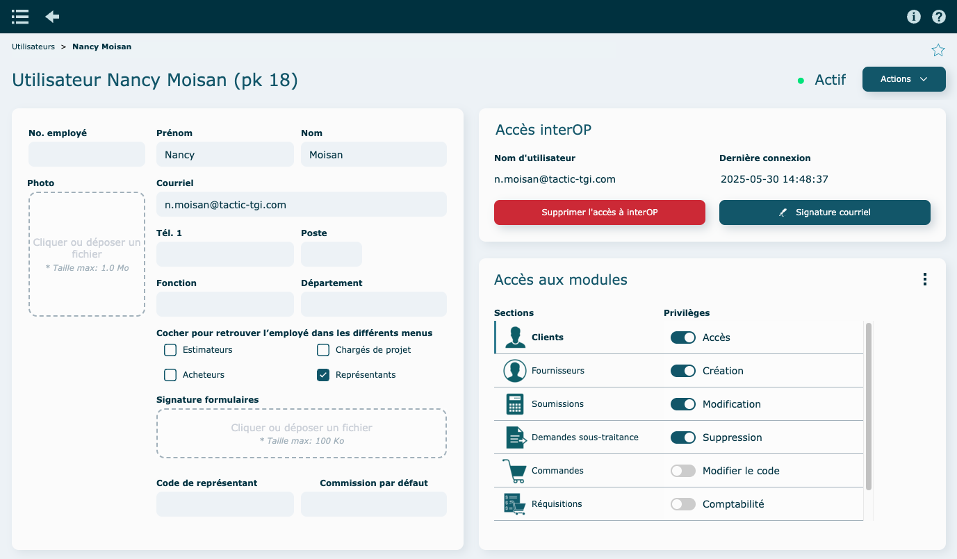 • Cliquez sur Créer l'accès à interOP. Un courriel s'ouvrira pour faire parvenir à l'utilisateur son mot de passe lors de sa première connexion.