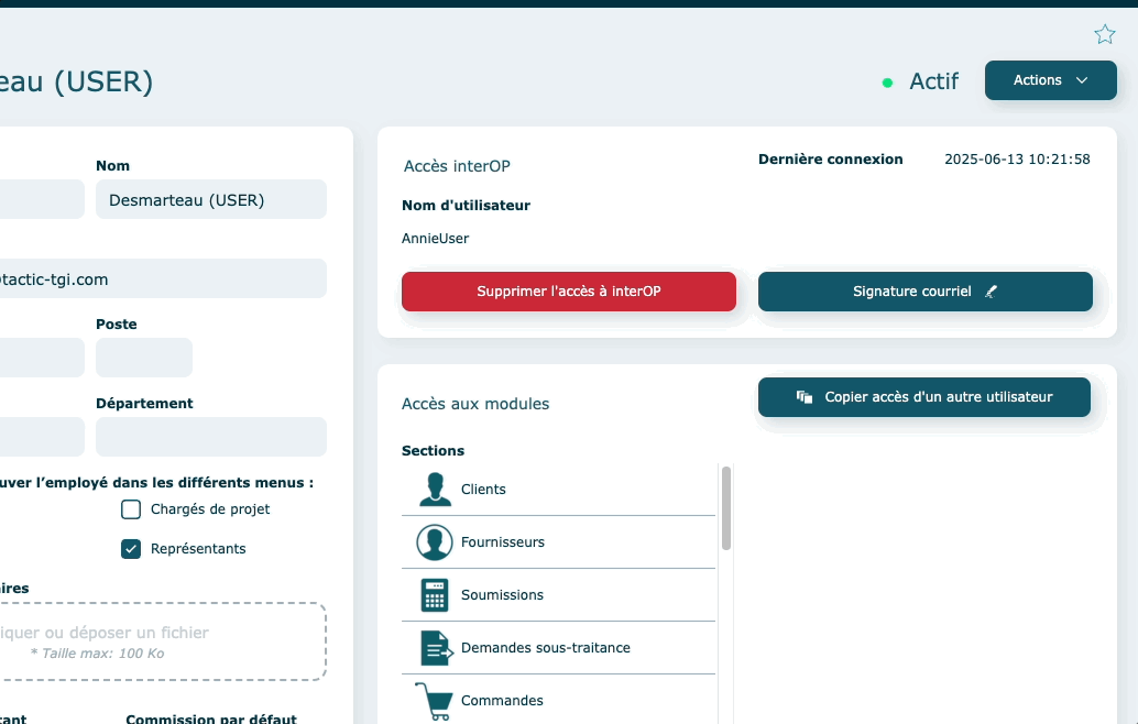 Utilisez le bouton rouge Supprimer l'accès à interOP dans la fiche de l'utilisateur pour lui enlever l'accès.