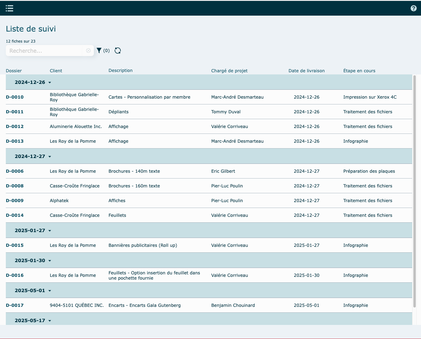 Chaque lancement de travail en production est ajouté à cette liste et y demeure tant que le dossier n’est pas facturé, ce qui permet d’avoir la liste complète des contrats actifs.