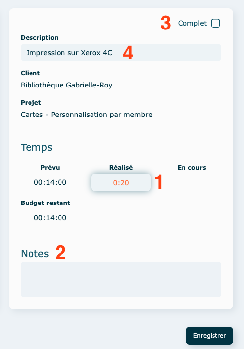 Le temps total prévu et restant (opérations non terminées) se trouve dans la portion de droite. Vous pouvez aussi cliquer sur une opération et la terminer par la case Complet en haut à droite.